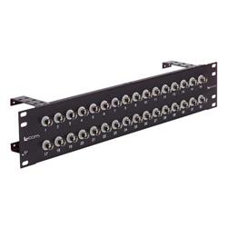This 50 Ohm grounded BNC female feedthru rack panel features 32 ports each with a write on area for easy port identification. Panels are made from 16 gauge cold rolled steel and finished with a durable black powdercoat. A cable minder feature is included to manage cable routing. The industry standard 2U height will fit most rack panels.