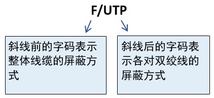 F/UTP – 整體箔層屏蔽/雙絞線未屏蔽:線纜整體箔層屏蔽,4對雙絞線未屏蔽。常用于10GBaseT用途。