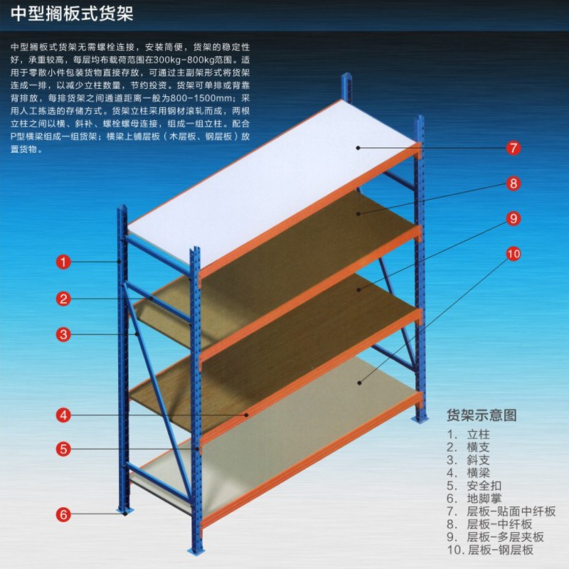 單元貨架每層載重量一般在200~500kg之間,總承載一般不大于500kg。單元貨架跨度通常不大于2.6m,深度不大于1m,高度一般在3m以內(nèi)。單元貨架跨度在2m以內(nèi),層載在500kg以內(nèi),通常選有梁式中型擱板式貨架較為相宜;假如單元貨架跨度在2m以上,則一般只能選有梁式中型焊接的為C型鋼式立柱、P型梁貨架結(jié)構(gòu),層間距可調(diào)缺高地更大,更牢固、美麗,與環(huán)境的和諧性更好,更適于一些干凈度要求較高的倉(cāng)庫(kù);有梁式中型擱板式貨架產(chǎn)業(yè)化特色強(qiáng)一些,較適用于寄放金屬結(jié)構(gòu)產(chǎn)品。中型擱板式貨架使用廣泛,適用于各行各業(yè)。